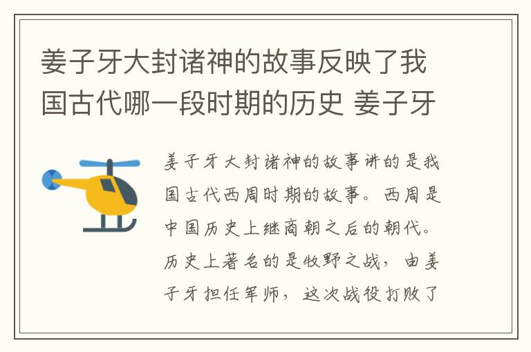 姜子牙大封诸神的故事讲的是我国古代西周时期的故事。西周是中国历史上继商朝之后的朝代。历史上著名的是牧野之战,由姜子牙担任军师,这次战役打败了商朝军队,最后商纣王自杀而死。姜子牙是古典名著《封神演义》主角,姜子牙的故事还出现在电视剧《封神榜》,该剧主要讲了西周的建立,以及西周灭商的故事。