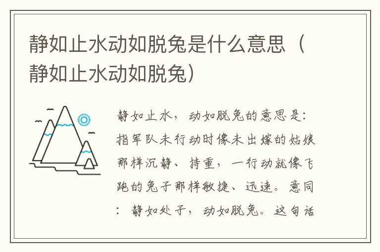 静如止水,动如脱兔的意思是:指军队未行动时像未出嫁的姑娘那样沉静、持重,一行动就像飞跑的兔子那样敏捷、迅速。意同:静如处子,动如脱兔。