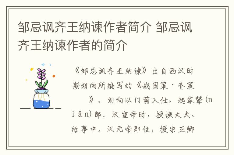 《邹忌讽齐王纳谏》出自西汉时期著名的经学家、目录学家、文学家刘向所编写的《战国策·齐策一》。刘向以门荫入仕,起家辇(niǎn)郎。