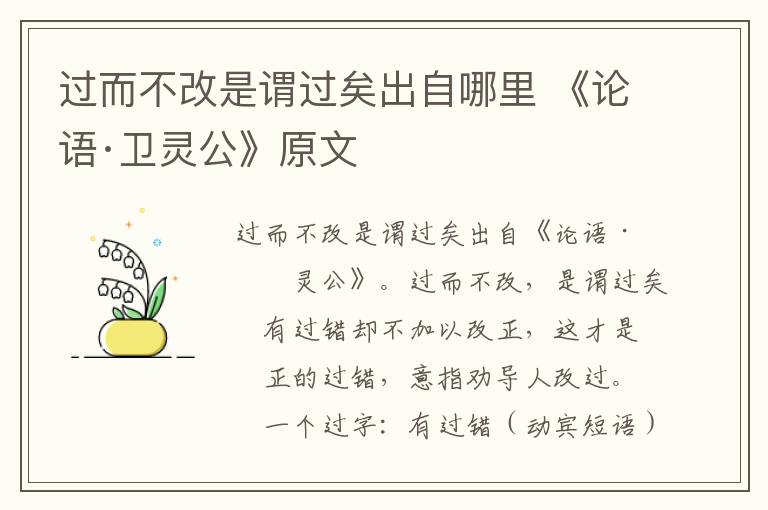 过而不改是谓过矣出自《论语·卫灵公》。过而不改,是谓过矣指有过错却不加以改正,这才是真正的过错,意指劝导人改过。第一个过字:有过错(动宾短语),第二个过字:过错(名词)。该篇包括42章,本篇内容涉及到孔子的“君子小人”观的若干方面、孔子的教育思想,以及孔子在其他方面的言行。
