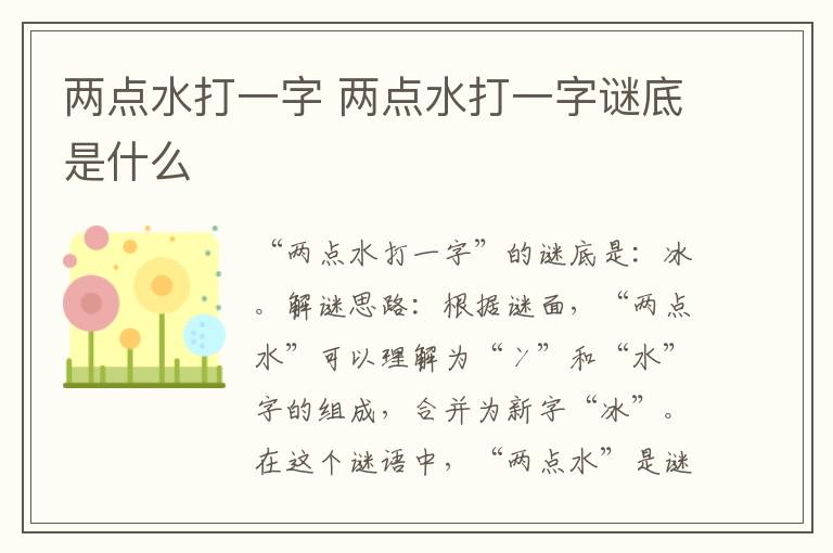 “两点水打一字”的谜底是:冰。解谜思路:根据谜面,“两点水”可以理解为“冫”和“水”字的组成,合并为新字“冰”。在这个谜语中,“两点水”是谜面,“打一字”是谜目,谜底是冰。