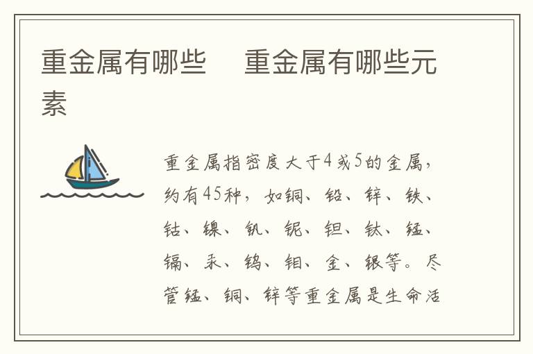 重金属指密度大于4或5的金属,约有45种,如铜、铅、锌、铁、钴、镍、钒、铌、钽、钛、锰、镉、汞、钨、钼、金、银等。尽管锰、铜、锌等重金属是生命活动所需要的微量元素,但是大部分重金属如汞、铅、镉等并非生命活动所必须,而且所有重金属超过一定浓度都对人体有毒。