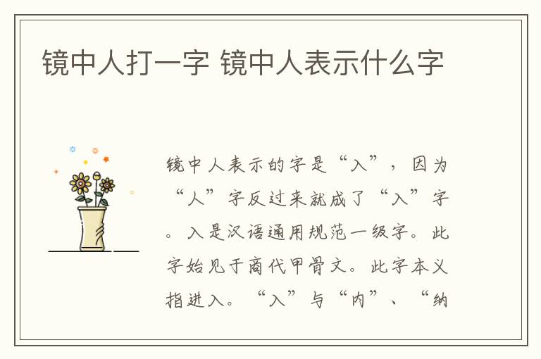 镜中人表示的字是“入”,因为“人”字反过来就成了“入”字。入是汉语通用规范一级字。此字始见于商代甲骨文。此字本义指进入。“入”与“内”、“纳”古本同源,因此,“入”有纳义,既表示献纳、交纳,又表示收纳、采纳。