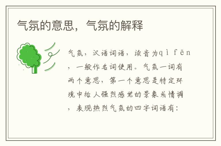 气氛,汉语词语,读音为qì fēn,一般作名词使用。气氛一词有两个意思,第一个意思是特定环境中给人强烈感觉的景象或情调,表现热烈气氛的四字词语有:欢欢喜喜、兴高采烈、兴致勃勃、欢呼雀跃、欢欣鼓舞、喜上眉梢、眉开眼笑、欢聚一堂。第二个意思是指显示吉凶的氛围。词语出自汉代刘向的《说苑·辨物》:“登灵台以望气氛。”