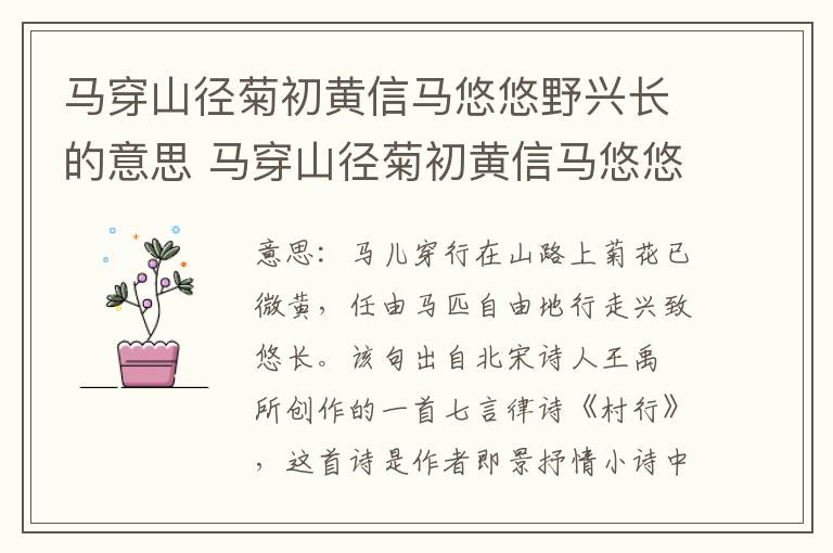 意思:马儿穿行在山路上菊花已微黄,任由马匹自由地行走兴致悠长。该句出自北宋诗人王禹偁所创作的一首七言律诗《村行》,这首诗是作者即景抒情小诗中的代表作之一这首诗以村行为线索,以多彩之笔逼真地描绘了山野迷人的景色,以含蓄的诗语真切地抒发了诗人拳拳思乡之情。