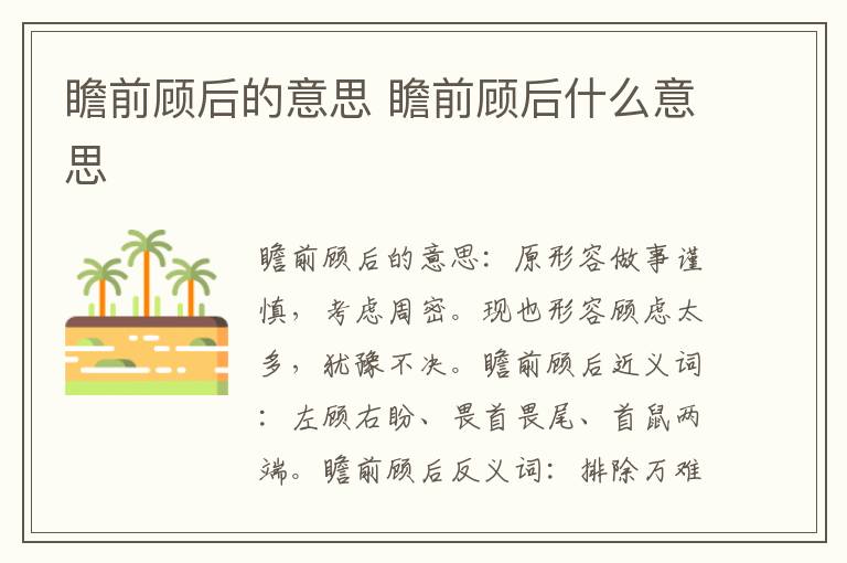 瞻前顾后的意思:原形容做事谨慎,考虑周密。现也形容顾虑太多,犹豫不决。瞻前顾后近义词:左顾右盼、畏首畏尾、首鼠两端。瞻前顾后反义词:排除万难、破釜沉舟、顶天立地。