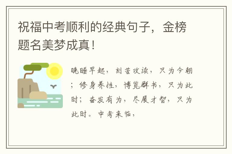 晚睡早起,刻苦攻读,只为今朝;修身养性,博览群书,只为此时;奋发有为,尽展才智,只为此时。中考来临,愿你中考顺意,如鱼得水!金榜题名,美梦成真!