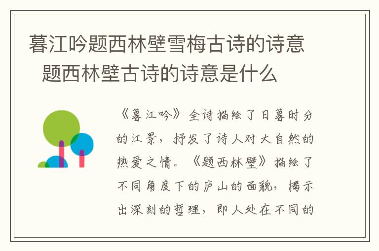 《暮江吟》全诗描绘了日暮时分的江景,抒发了诗人对大自然的热爱之情。《题西林壁》描绘了不同角度下的庐山的面貌,揭示出深刻的哲理,即人处在不同的立场,看问题的出发点不同,对事物的认识也会不同。《雪梅》全诗阐述了梅、雪、诗三者的关系,最后揭示出三者的结合才能组成最美丽的春色。