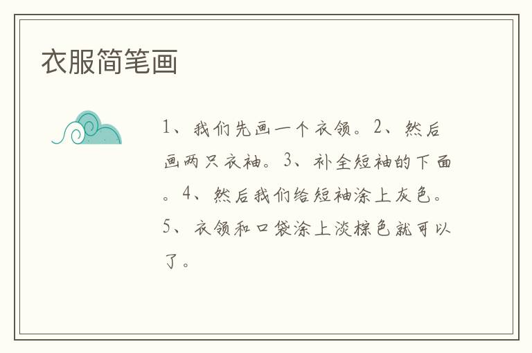 衣服简笔画 知识分享 10月8日 编辑 童画 取消关注 关注 私信 1、我们先画一个衣领。 2、然后画两只衣袖。 3、补全短袖的下面。 4、然后我们给短袖涂上灰色。 5、衣领和口袋涂上淡棕色就可以了。 No related posts. 本文内容由互联网用户自发贡献,该文观点仅代表作者本人。本站仅提供信息存储空间服务,不拥有所有权,不承担相关法律责任。如发现本站有涉嫌抄袭侵权/违法违规的内容, 请发送邮件至 2245678901@qq.com 举报,一经查实,本站将立刻删除。 给TA打赏 共{{data.count}}人 人已打赏