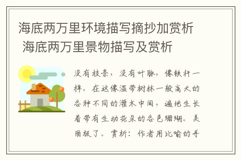 1、没有枝条,没有叶脉,像铁杆一样。在这像温带树林一般高大的各种不同的灌木中间,遍地生长着带有生动花朵的各色珊瑚。美丽极了。赏析:作者用比喻的手法生动的表现出海底世界的美丽,不禁令人神往。尽管海底景色优美,同时这里也险象丛生、千钧一发。