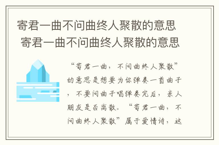 “寄君一曲,不问曲终人聚散”的意思是想要为你弹奏一首曲子,不要问曲子唱弹奏完后,亲人朋友是否离散。“寄君一曲,不问曲终人聚散”属于爱情诗,这句一方面象征着一种对离别洒脱的心态,另一方面也有一些悲凉的意味在其中。