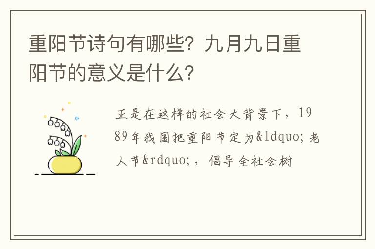 正是在这样的社会大背景下,1989年我国把重阳节定为“老人节”,倡导全社会树立敬老、孝老、爱老的风气。小编为大家带来了九月九日重阳节相关内容。