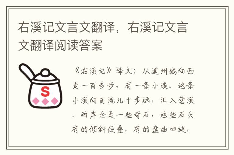 《右溪记》是唐代文学家元结的一篇散文。此文可分为两层:第一层描写小溪的环境清幽秀美;第二层感叹小溪不为人所赏识,作者修葺之后将其命名为"右溪"。这篇散文着重描写了右溪的自然风光,记叙了对它整修的过程。行文流畅简洁,文笔隽永淡雅,风格纯真自然,状物记事,层次分明,仅用一百余字,便把右溪的自然情趣描绘得历历在目。文章感慨于道州(今湖南道县)城边一条无名小溪,这里石奇泉清、草木葱郁,环境优美异常,但长期不为人所知。因无人赏爱而芜秽冷落,作者借此寄托自己怀才不遇、壮志难酬的身世愤忿,以及因坎坷遭遇而爱惜才用的情怀。