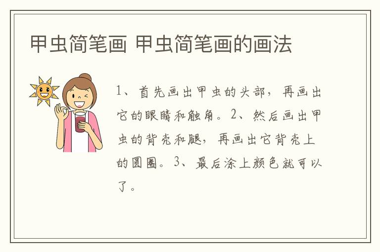 甲虫简笔画 甲虫简笔画的画法 知识分享 10月12日 编辑 童画 取消关注 关注 私信 1、首先画出甲虫的头部,再画出它的眼睛和触角。 2、然后画出甲虫的背壳和腿,再画出它背壳上的圆圈。 3、最后涂上颜色就可以了。 No related posts. 本文内容由互联网用户自发贡献,该文观点仅代表作者本人。本站仅提供信息存储空间服务,不拥有所有权,不承担相关法律责任。如发现本站有涉嫌抄袭侵权/违法违规的内容, 请发送邮件至 2245678901@qq.com 举报,一经查实,本站将立刻删除。 给TA打赏 共{{data.count}}人 人已打赏