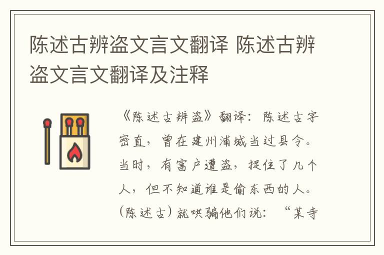 《陈述古辨盗》翻译:陈述古字密直,曾在建州浦城当过县令。当时,有富户遭盗,捉住了几个人,但不知道谁是偷东西的人。(陈述古)就哄骗他们说:“某寺里有一口钟,十分灵验,它能把真正的小偷辨认出来。”于是,陈述古就让人去把这口钟迎到县府衙门来放到后阁供奉着。接着,他把囚犯们引来站在钟的前面,当面告诉他们说:“不是小偷摸这口钟就没有声音,如果是小偷,那么一摸就会发出声音。”