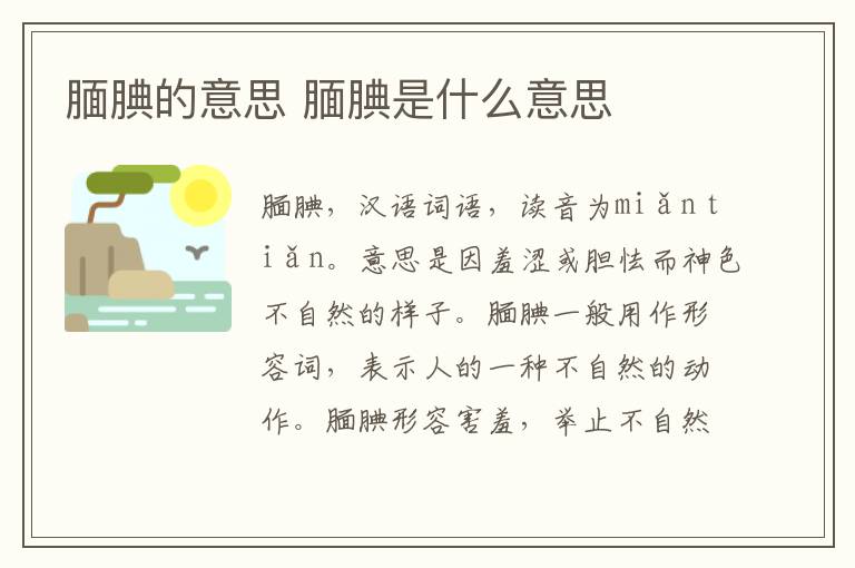 腼腆,汉语词语,读音为miǎn tiǎn。意思是因羞涩或胆怯而神色不自然的样子。腼腆一般用作形容词,表示人的一种不自然的动作。腼腆形容害羞,举止不自然或微笑,多用于易怯场的人;常见于在交流方面存在障碍或无法自正常和陌生人交流的人;为了掩饰内心的恐惧和焦虑亦会如此。