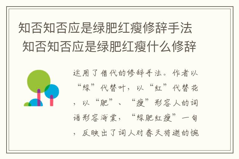 “知否,知否?应是绿肥红瘦”运用了借代的修辞手法,作者以“绿”代替叶,以“红”代替花,以“肥”、“瘦”形容人的词语形容海棠,“绿肥红瘦”一句,反映出了词人对春天将逝的惋惜之情。