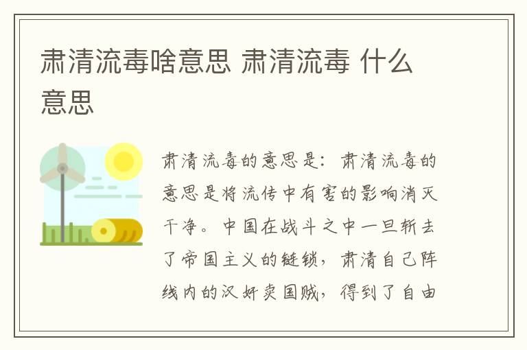 肃清流毒的意思是:肃清流毒的意思是将流传中有害的影响消灭干净。中国在战斗之中一旦斩去了帝国主义的链锁,肃清自己阵线内的汉奸卖国贼,得到了自由和解放,这种创造力,将会无限地发挥出来。指削平。《文选陆机汉高祖功臣颂》二州肃清,四邦咸举。