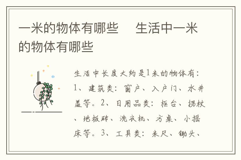 生活中长度大约是1米的物体有:1、建筑类:窗户、入户门、水井盖等。2、日用品类:柜台、拐杖、地板砖、洗衣机、方桌、小摇床等。3、工具类:米尺、锄头、扫帚、三角架、宝剑、大杆秤等。4、身体类:3岁小朋友的平均身高、成年人长裤。5、动物类:成年猪、大羊等。