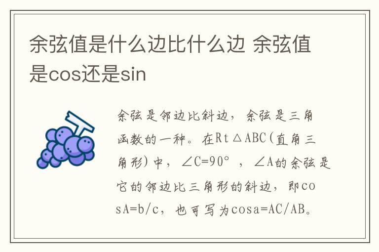 余弦是邻边比斜边,余弦是三角函数的一种。在Rt△ABC(直角三角形)中,∠C=90°,∠A的余弦是它的邻边比三角形的斜边,即cosA=b/c,也可写为cosa=AC/AB。余弦函数:f(x)=cosx(x∈R)。