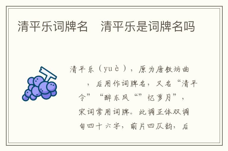 清平乐(yuè),原为唐教坊曲名,后用作词牌名,又名“清平乐令”“醉东风“”忆萝月”,为宋词常用词牌。此调正体双调八句四十六字,前片四仄韵,后片三平韵。晏殊、晏几道、黄庭坚、辛弃疾等词人均用过此调,其中晏几道尤多。同时又是曲牌名。属南曲羽调。