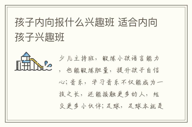 少儿主持班,锻炼小孩语言能力,也能锻炼胆量,提升孩子自信心;音乐,学习音乐不仅能成为一技之长,还能接触更多的人,结交更多小伙伴;足球,足球本就是一项集体运动,团队之间需要沟通、团结,很适合内向的孩子。