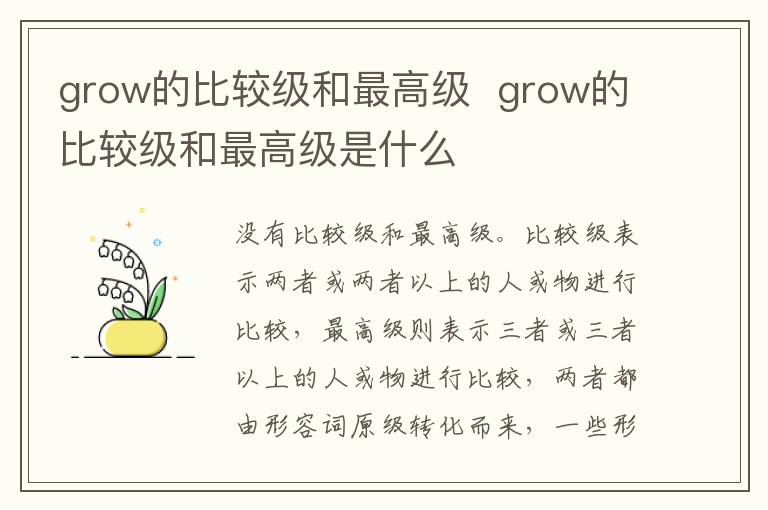 grow的比较级和最高级 grow的比较级和最高级是什么 知识分享 10月16日 编辑 童画 取消关注 关注 私信 grow是一个动词,所以没有比较级和最高级。比较级表示两者或两者以上的人或物进行比较,最高级则表示三者或三者以上的人或物进行比较,两者都由形容词原级转化而来,一些形容词是规则变化一些是不规则变化,动词没有比较级或者最高级。 No related posts. 本文内容由互联网用户自发贡献,该文观点仅代表作者本人。本站仅提供信息存储空间服务,不拥有所有权,不承担相关法律责任。如发现本站有涉嫌抄袭侵权/违法违规的内容, 请发送邮件至 2245678901@qq.com 举报,一经查实,本站将立刻删除。 给TA打赏 共{{data.count}}人 人已打赏