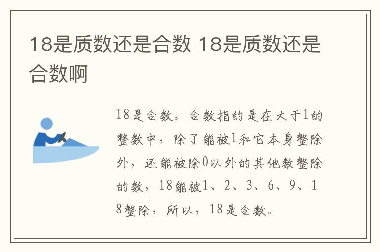 18是质数还是合数 18是质数还是合数啊 知识分享 10月16日 编辑 童画 取消关注 关注 私信 18是合数。合数指的是在大于1的整数中,除了能被1和它本身整除外,还能被除0以外的其他数整除的数,18能被1、2、3、6、9、18整除,所以,18是合数。 质数指的是在大于1的自然数中,除了1和它本身以外,没有其他因数的自然数,如7的因数只有1和7,所以,7是质数。 No related posts. 本文内容由互联网用户自发贡献,该文观点仅代表作者本人。本站仅提供信息存储空间服务,不拥有所有权,不承担相关法律责任。如发现本站有涉嫌抄袭侵权/违法违规的内容, 请发送邮件至 2245678901@qq.com 举报,一经查实,本站将立刻删除。 给TA打赏 共{{data.count}}人 人已打赏