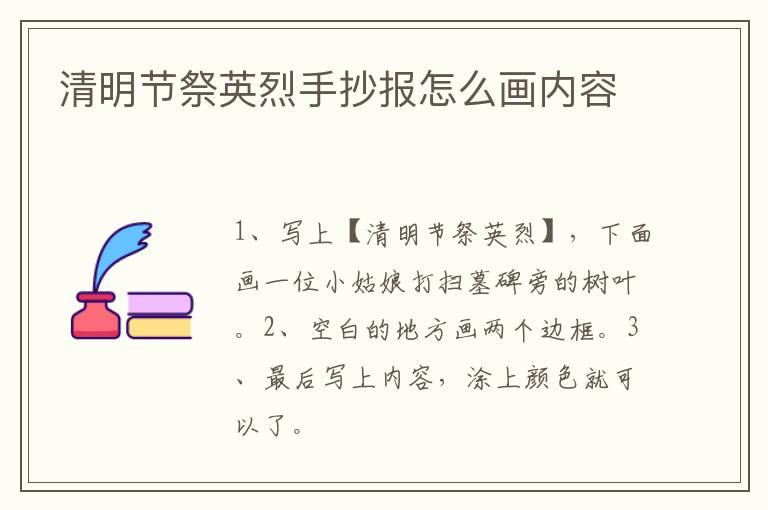 清明节祭英烈手抄报怎么画内容简单又漂亮 知识分享 10月19日 编辑 童画 取消关注 关注 私信 1、写上【清明节祭英烈】,下面画一位小姑娘打扫墓碑旁的树叶。 2、空白的地方画两个边框。 3、最后写上内容,涂上颜色就可以了。 No related posts. 本文内容由互联网用户自发贡献,该文观点仅代表作者本人。本站仅提供信息存储空间服务,不拥有所有权,不承担相关法律责任。如发现本站有涉嫌抄袭侵权/违法违规的内容, 请发送邮件至 2245678901@qq.com 举报,一经查实,本站将立刻删除。 给TA打赏 共{{data.count}}人 人已打赏