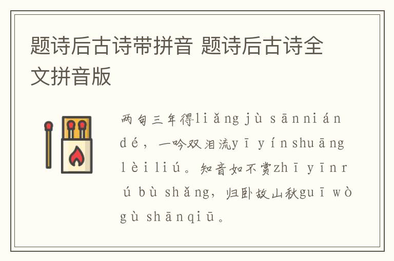《题诗后》是贾岛创作的一首五言绝句,这首诗就是他视艺术为生命,全身心投入,执着追求完美境界的精神风貌的真实写照,每字每句都精益求精,反复推敲。表现了诗人艺术劳动的艰辛、刻苦,也说明好诗佳句得来不易。贾岛这种苦吟精神,对后世颇有影响。