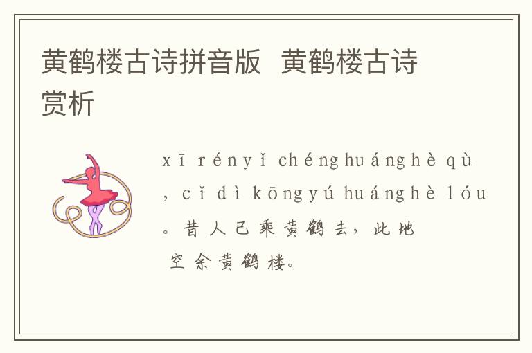 《黄鹤楼》是唐代诗人崔颢创作的一首七言律诗。此诗描写了在黄鹤楼上远眺的美好景色,是一首吊古怀乡之佳作。首联诗人满怀对黄鹤楼的美好憧憬慕名前来,可仙人驾鹤杳无踪迹,鹤去楼空,眼前就是一座寻常可见的江楼,为乡愁情结的抒发作了潜在的铺垫。颔联紧承首联,说自从仙人离去,黄鹤楼已经历经千百年之久,更加催生了乡愁。颈联描绘了一个空明、悠远的画面,尾联以