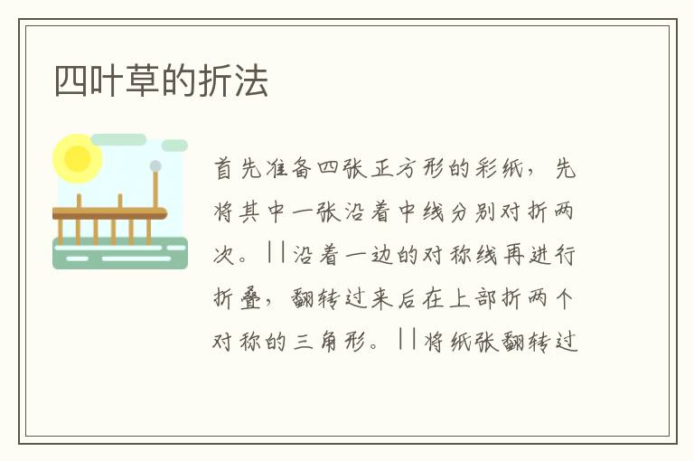 四叶草的折法 知识分享 10月19日 编辑 童画 取消关注 关注 私信 1、首先准备四张正方形的彩纸,先将其中一张沿着中线分别对折两次。 2、沿着一边的对称线再进行折叠,翻转过来后在上部折两个对称的三角形。 3、将纸张翻转过来,沿着底部进行对折,再次翻转折出四叶草顶部的圆弧状。 4、左右两边往里折,一片叶子折完后,再用同样的方法折其它三片叶子。 5、然后用固定胶连接起来,好看的四叶草就折好啦。 No related posts. 本文内容由互联网用户自发贡献,该文观点仅代表作者本人。本站仅提供信息存储空间服务,不拥有所有权,不承担相关法律责任。如发现本站有涉嫌抄袭侵权/违法违规的内容, 请发送邮件至 2245678901@qq.com 举报,一经查实,本站将立刻删除。 给TA打赏 共{{data.count}}人 人已打赏