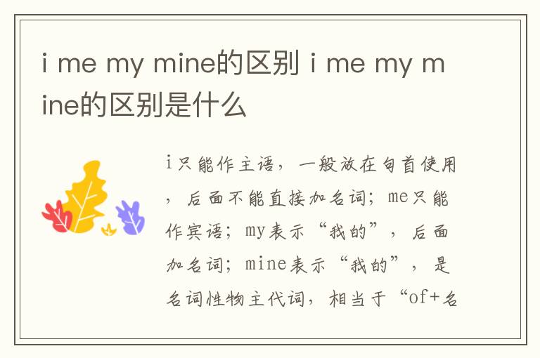 i只能作主语,一般放在句首使用,后面不能直接加名词;me只能作宾语;my表示“我的”,后面加名词;mine表示“我的”,是名词性物主代词,相当于“of+名词所有格”的组合。