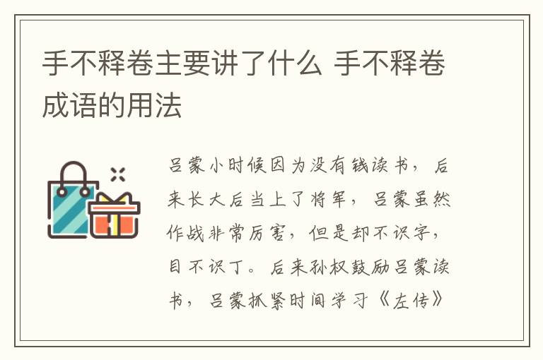 手不释卷主要讲的是:吕蒙小时候因为没有钱读书,后来长大后当上了将军,吕蒙虽然作战非常厉害,但是却不识字,目不识丁。后来孙权鼓励吕蒙读书,吕蒙抓紧时间学习《左传》、《孙子》、《史记》等史记,没过多久,吕蒙说话就可以引经据典,改变了别人对他“吴下阿蒙”的称呼。