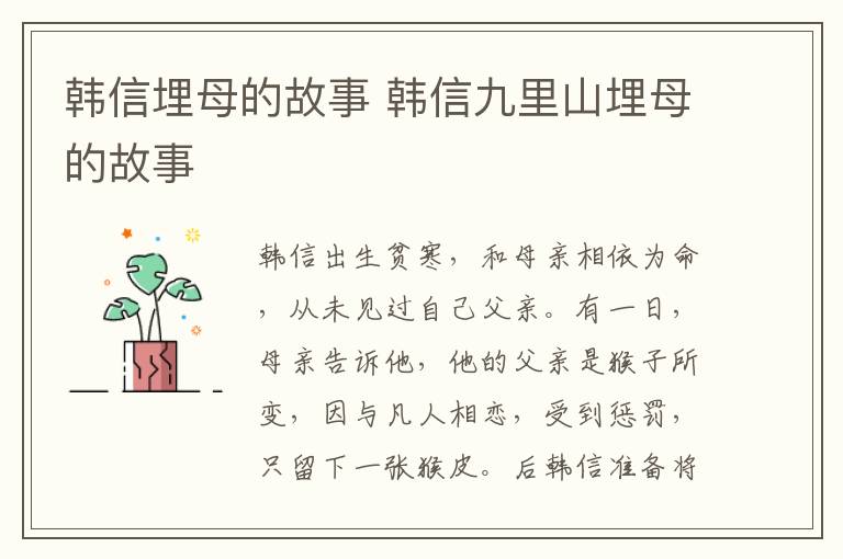 相传,年少时的韩信家境贫穷,为了养活老母,他只能给别人家放牛为生。韩信很小的时候就没有见过父亲,有一日,韩信问母亲自己的父亲去了哪里。母亲觉得是时候告诉孩子真相了,于是就从箱子底下取出了一张猴皮。