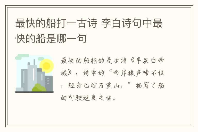 最快的船指的是古诗《早发白帝城》,诗中的“两岸猿声啼不住,轻舟已过万重山。”描写了船的行驶速度之快。