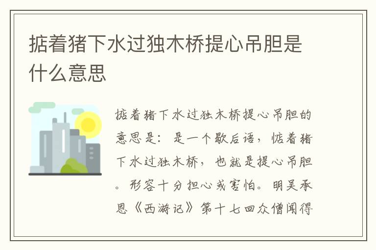 掂着猪下水过独木桥提心吊胆的意思是:是一个歇后语,惦着猪下水过独木桥,也就是提心吊胆。形容十分担心或害怕。明吴承恩《西游记》第十七回众僧闻得此言,一个个提心吊胆,告天许愿。但他们往往遭农会严厉拒绝,所以他们总是提心吊胆地过日子。