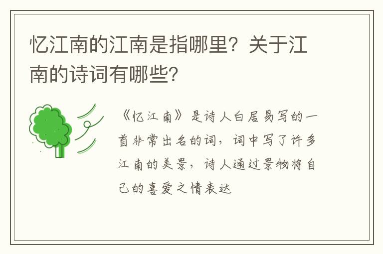 《忆江南》是诗人白居易写的一首非常出名的词,词中写了许多江南的美景,诗人通过景物将自己的喜爱之情表达了出来。那么诗人所说的江南到底是指的哪里呢?让我们一起来看看吧!