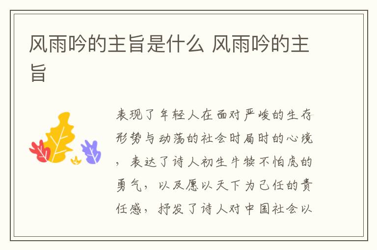 《风雨吟》的主旨:表现了年轻人在面对严峻的生存形势与动荡的社会时局时的心境,表达了诗人初生牛犊不怕虎的勇气,以及愿以天下为己任的责任感,抒发了诗人对中国社会以及民族命运的忧虑。