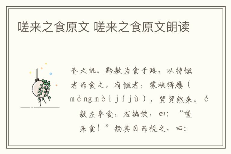 嗟来之食原文 嗟来之食原文朗读 知识分享 23年2月9日 编辑 童画 取消关注 关注 私信 嗟来之食 齐大饥。黔敖为食于路,以待饿者而食之。 有饿者,蒙袂辑屦(méng mèi jíjù),贸贸然来。黔敖左奉食,右执饮,曰:“嗟!来食!”扬其目而视之,曰:“予惟不食嗟来之食以至于斯也!”从而谢焉,终不食而死。曾子闻之,曰:“微与!其嗟也,可去,其谢也,可食。” No related posts. 本文内容由互联网用户自发贡献,该文观点仅代表作者本人。本站仅提供信息存储空间服务,不拥有所有权,不承担相关法律责任。如发现本站有涉嫌抄袭侵权/违法违规的内容, 请发送邮件至 2245678901@qq.com 举报,一经查实,本站将立刻删除。 给TA打赏 共{{data.count}}人 人已打赏