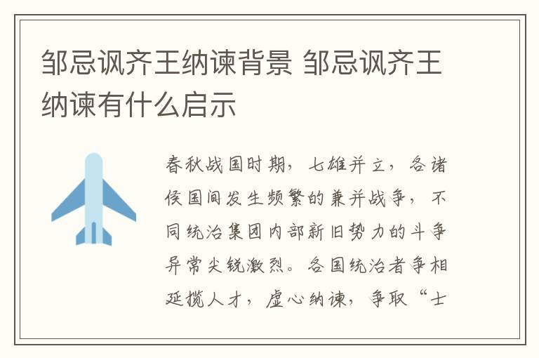 《邹忌讽齐王纳谏》的背景:春秋战国时期,七雄并立,各诸侯国间有频繁的兼并战争,不同统治集团内部新旧势力的斗争异常尖锐激烈。各国统治者争相延揽人才,虚心纳谏,争取“士”的支持。齐威王继位后,不治朝事,大臣邹忌就讽谏齐王,劝说齐王纳谏,革除弊端,改良政治。