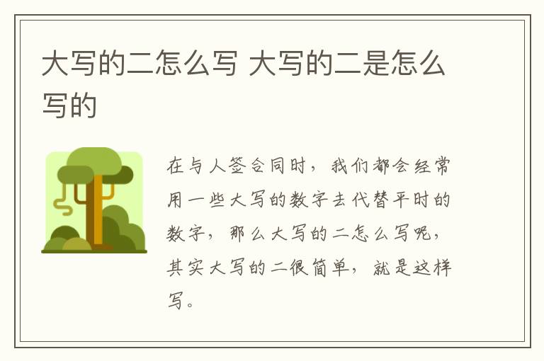 大写的二怎么写 大写的二是怎么写的 知识分享 23年2月9日 编辑 童画 取消关注 关注 私信 在与人签合同时,我们都会经常用一些大写的数字去代替平时的数字,那么大写的二怎么写呢,其实大写的二很简单,就是这样写。 No related posts. 本文内容由互联网用户自发贡献,该文观点仅代表作者本人。本站仅提供信息存储空间服务,不拥有所有权,不承担相关法律责任。如发现本站有涉嫌抄袭侵权/违法违规的内容, 请发送邮件至 2245678901@qq.com 举报,一经查实,本站将立刻删除。 给TA打赏 共{{data.count}}人 人已打赏