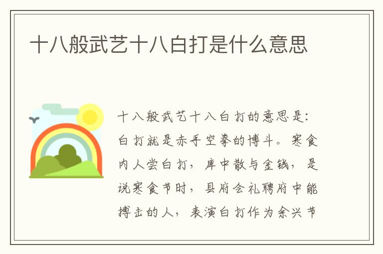 十八般武艺十八白打的意思是:白打就是赤手空拳的博斗,唐代诗人王建云:“寒食内人尝白打,库中散与金钱”,是说寒食节时,县府会礼聘府中能搏击的人,表演白打作为余兴节目。清初周亮工《闽小记》也说:“白打,即今之手搏,名短打者是也。昔日白手不持寸铁为白战,武艺十八,终以白打。以白打为终,明乎其不持寸铁也。