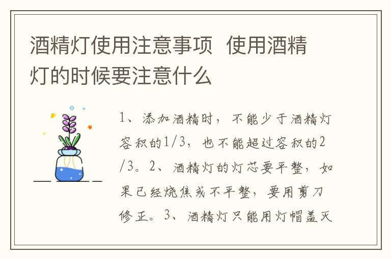 使用酒精灯的注意事项:1、添加酒精时,不能少于酒精灯容积的1/3,也不能超过容积的2/3。2、酒精灯的灯芯要平整,如果已经烧焦或不平整,要用剪刀修正。3、酒精灯只能用灯帽盖灭,不可用嘴去吹。4、如果洒出的酒精在桌面燃烧,应该立即用湿布或沙子扑灭。