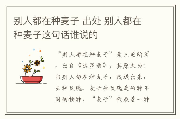 “别人都在种麦子”是三毛所写,出自《流星雨》。其原文为:当别人都在种麦子,我退出来,去种玫瑰。麦子和玫瑰是两种不同的物种,“麦子”代表着一种平民化的经济作物,是一种食物,也可以说是物质基础;而“玫瑰”代表美好的事物,比如爱情,是一种可望而不可得的奢侈品。这句话意思是人生没有很多两全其美的事情,要学会取舍。