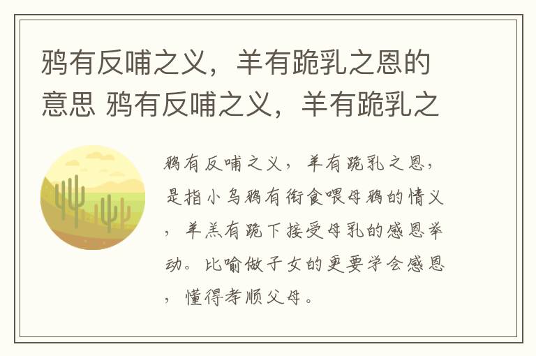 鸦有反哺之义,羊有跪乳之恩,是指小乌鸦有衔食喂母鸦的情义,羊羔有跪下接受母乳的感恩举动。比喻做子女的更要学会感恩,懂得孝顺父母。