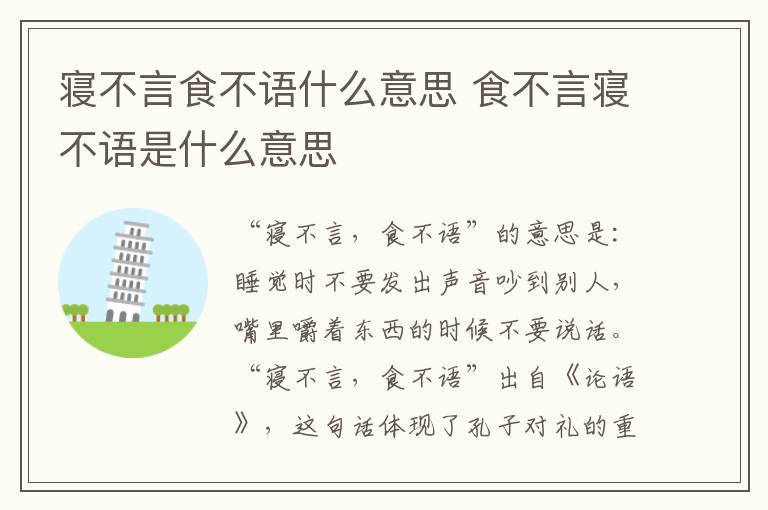 “寝不言,食不语”的意思是:睡觉时不要发出声音吵到别人,嘴里嚼着东西的时候不要说话。“寝不言,食不语”出自《论语》,这句话体现了孔子对礼的重视,人的衣食住行都应该符合“礼”的规范。