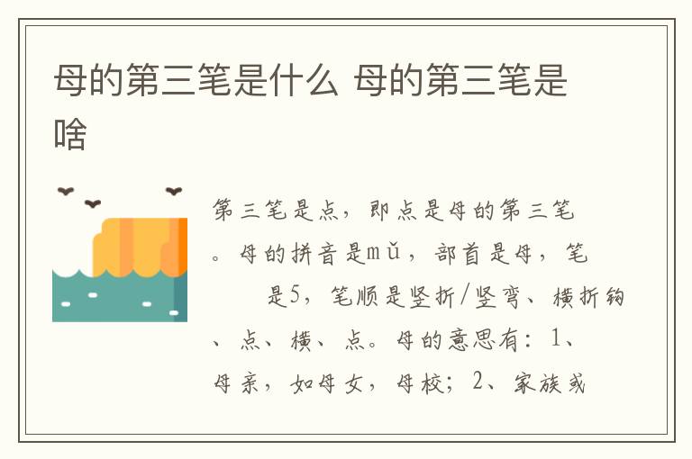 母的拼音是mǔ,部首是母,笔画是5,笔顺是竖折/竖弯、横折钩、点、横、点。
