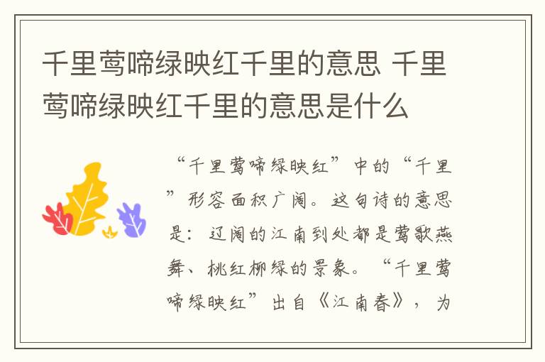“千里莺啼绿映红”中的“千里”形容面积广阔。这句诗的意思是:辽阔的江南到处都是莺歌燕舞、桃红柳绿的景象。“千里莺啼绿映红”出自《江南春》,为唐代诗人杜牧的诗句,全诗描绘了明媚的江南春光。