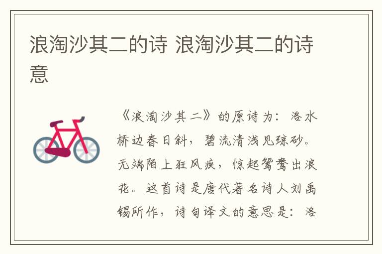 《浪淘沙其二》的原诗为:洛水桥边春日斜,碧流清浅见琼砂。无端陌上狂风疾,惊起鸳鸯出浪花。这首诗是唐代著名诗人刘禹锡所作,诗句译文的意思是:洛水桥边春天的太阳西斜,碧流又清又浅看得见水底的琼砂。路上无端刮起急剧的狂风,惊得鸳鸯逃出了水中浪花。